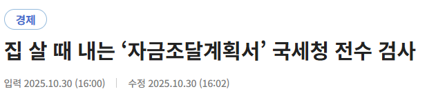 2025.10.30. KBS 언론보도에 따르면 국세청에서 자금조달계획서 전체를 검사한다고 합니다.