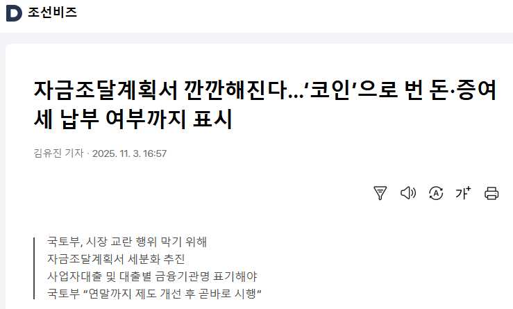 주택취득자금조달계획서와 관련된 조선비즈의 2025.11.3. 기사 내용을 보면 자금조달계획서 양식이 지금보다 세부적으로 개정될 것으로 보입니다.