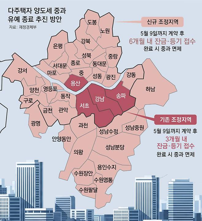 강남 3구(강남ㆍ서초ㆍ송파)와 용산구 등 기존 조정대상지역은 5월 9일까지 매도 계약을 체결하고 3개월 이내 잔금ㆍ등기를 마칠 경우 양도세 중과 유예 혜택을 그대로 적용받는다.