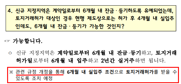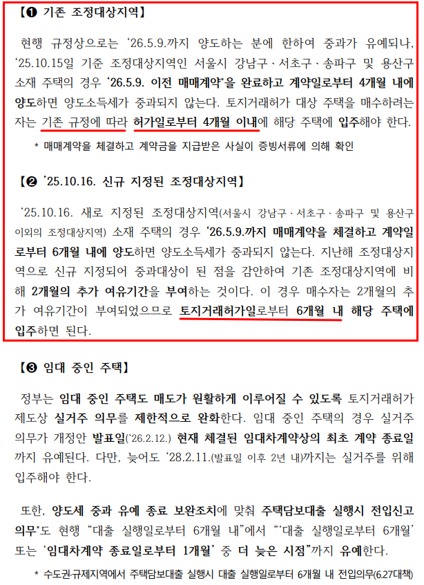 ??? 2026.2.12. 보도자료 중 ➋ '25.10.16. 신규 지정 조정대상지역의 경우 토지거래허가일로부터 6개월 내 해당 주택에 입주하면 된다고 되어 있으며, 참고 자료 1의 4에서 관련 규정 개정을 통해 6개월 내 실입주 조건으로 토지거래허가를 받을 수 있도록 조치 예정이라 하였으나 현재 관련 법령이나 보도자료, 정부의 지침 등을 확인하지 못하였습니다.