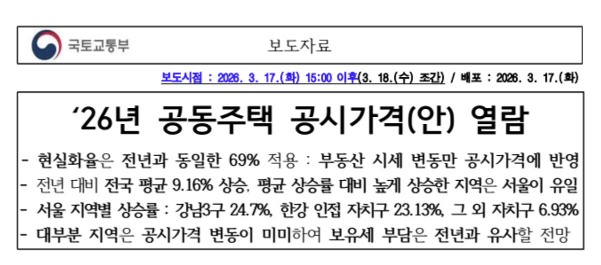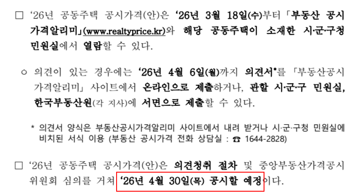 2026년 공동주택 공시가격(안) 열람과 관련된 국토교통부 보도자료입니다. 2026년 공동주택 공시가격은 4월 30일 공시 예정입니다.